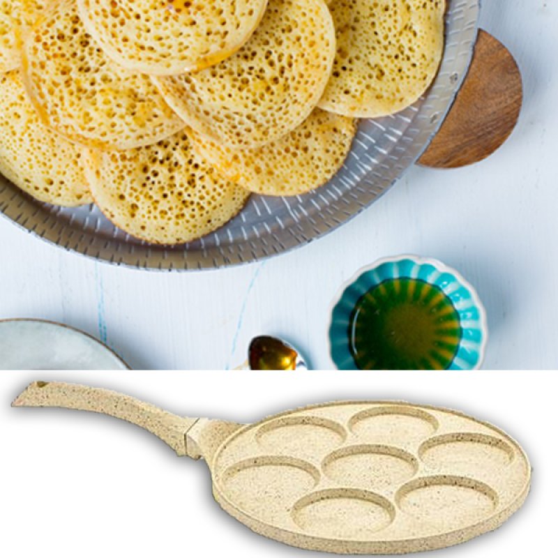 Cette Crêpière permet de faire cuire simultanément 7 Mini Beghrir ou pancakes, sans qu’ils n’accrochent les uns aux autres.