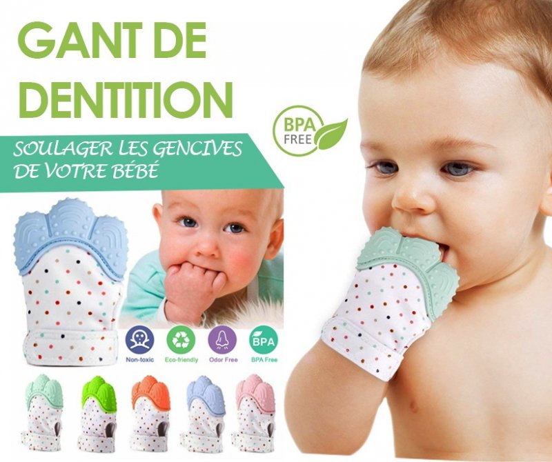 Le gant de dentition en silicone est un jouet indispensable pendant la poussée dentaire de bébé. Elle permet de soulager ses gencives même s'il est trop petit pour tenir un anneau de dentition.