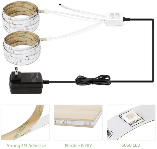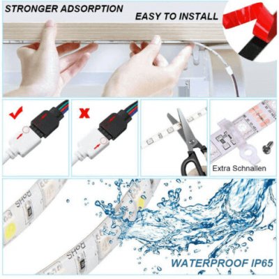 تحتوي المجموعة على مصابيح شريطية وصندوق تحكم ومحول مما يعني أنك لست بحاجة إلى شراء أي أدوات لتركيبها، فقط فك الشريط ولصقه على المكان المراد إضائته. كما تستطيع القيام بتقسيم الشريط عن طريق تقطيعها الى شرائط حسب الحاجة.